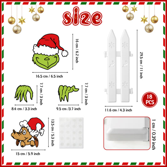 CZgfva 24Pcs Green Monster Fence Peeker Decoration Set Thick White Plastic Picket Christmas Tree Fence with Funny Green Monster Dog Fence Peeker Sign Whoville Christmas Decor for Xmas Party Home Yard